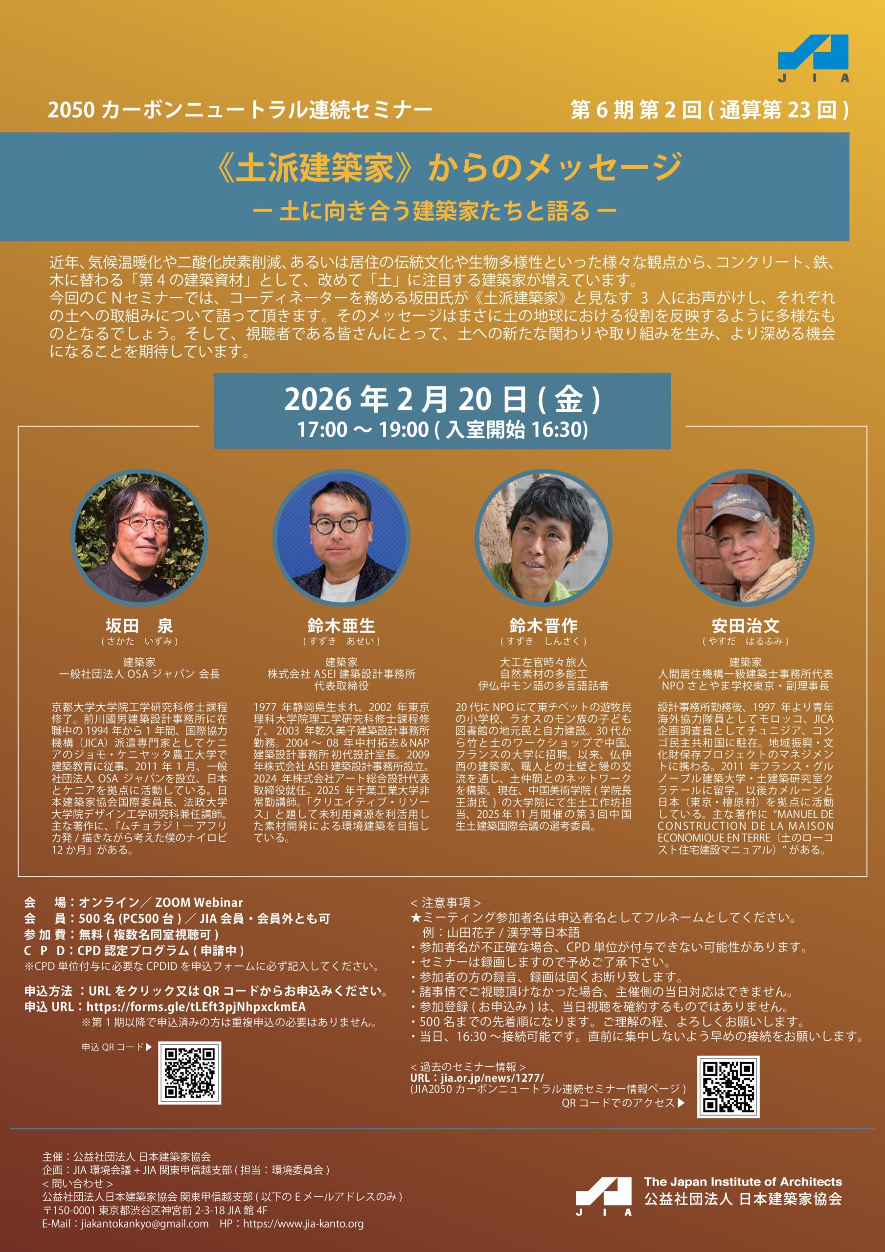| 内容 | 2050カーボンニュートラル連続セミナー 《土派建築家》からのメッセージ 近年、気候温暖化や二酸化炭素削減、あるいは居住の伝統文化や生物多様性といった様々な観点から、コンクリート、鉄、木に替わる「第4の建築資材」として、改めて「土」に注目する建築家が増えています。 今回のCNセミナーでは、コーディネーターを務める坂田氏が《土派建築家》と見なす3人にお声がけし、それぞれの土への取組みについて語って頂きます。そのメッセージはまさに土の地球における役割を反映するように多様なものとなるでしょう。 そして、視聴者である皆さんにとって、土への新たな関わりや取り組みを生み、より深める機会になることを期待しています。