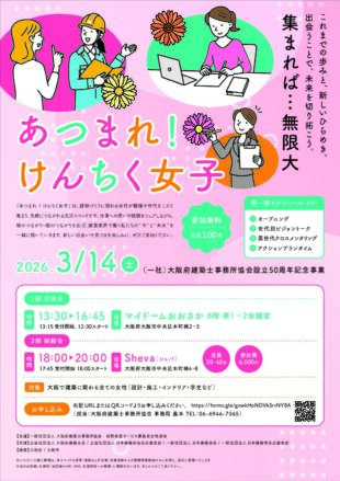 | 主催・共催等 | 【主催】:一般社団法人 大阪府建築士事務所協会 会勢会員サービス委員会女性部会 【共催】:公益社団法人 大阪府建築士会 / 公益社団法人 日本建築家協会近畿支部 / 一般社団法人 日本建築協会 / 一般社団法人 日本建築学会近畿支部 【後援】:大阪府 / 大阪市 |