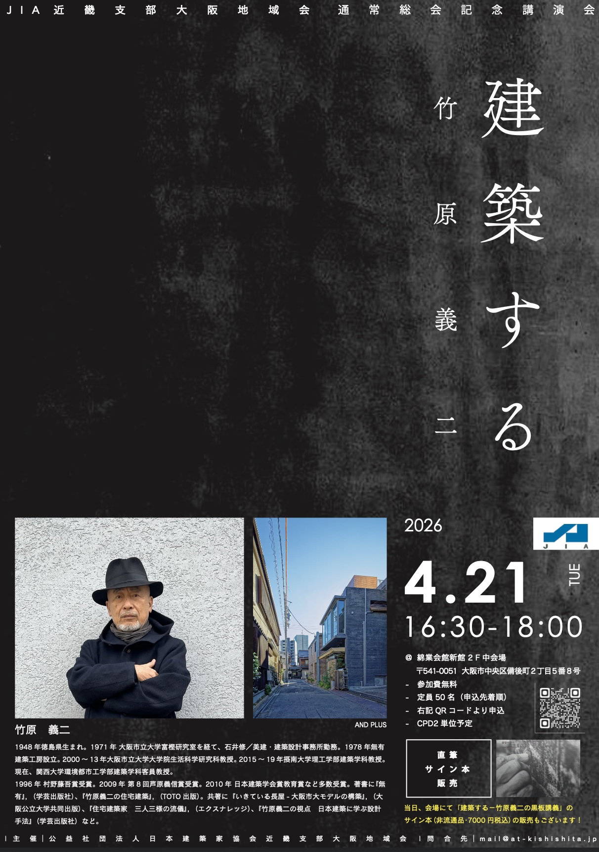 | イベント名称 | JIA大阪地域会通常総会記念講演会 「竹原義二_建築する」 |