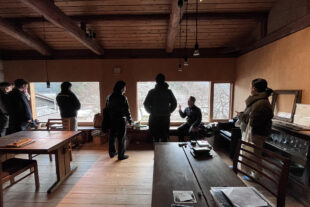 当日の静原集落は小雪がちらつきとても幻想的ななか、事務所、住居、ゲストハウスといった場所を案内していだき、自分たちの手で造るということ、材料の本質を知ることの大切さを今一度考えなおすことができました。